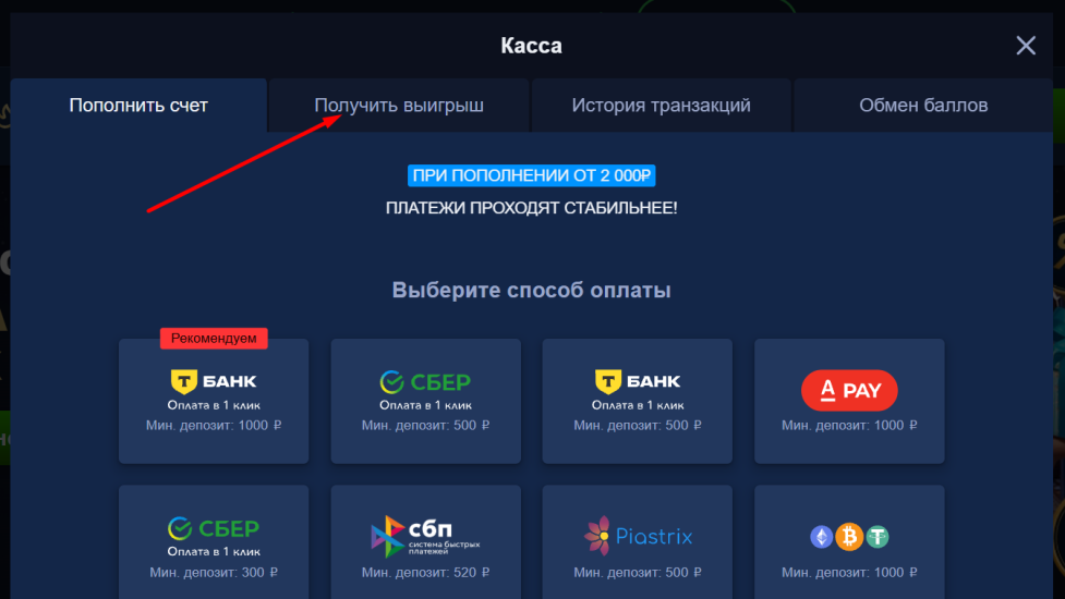 Перейти в раздел “Получить выигрыш”.